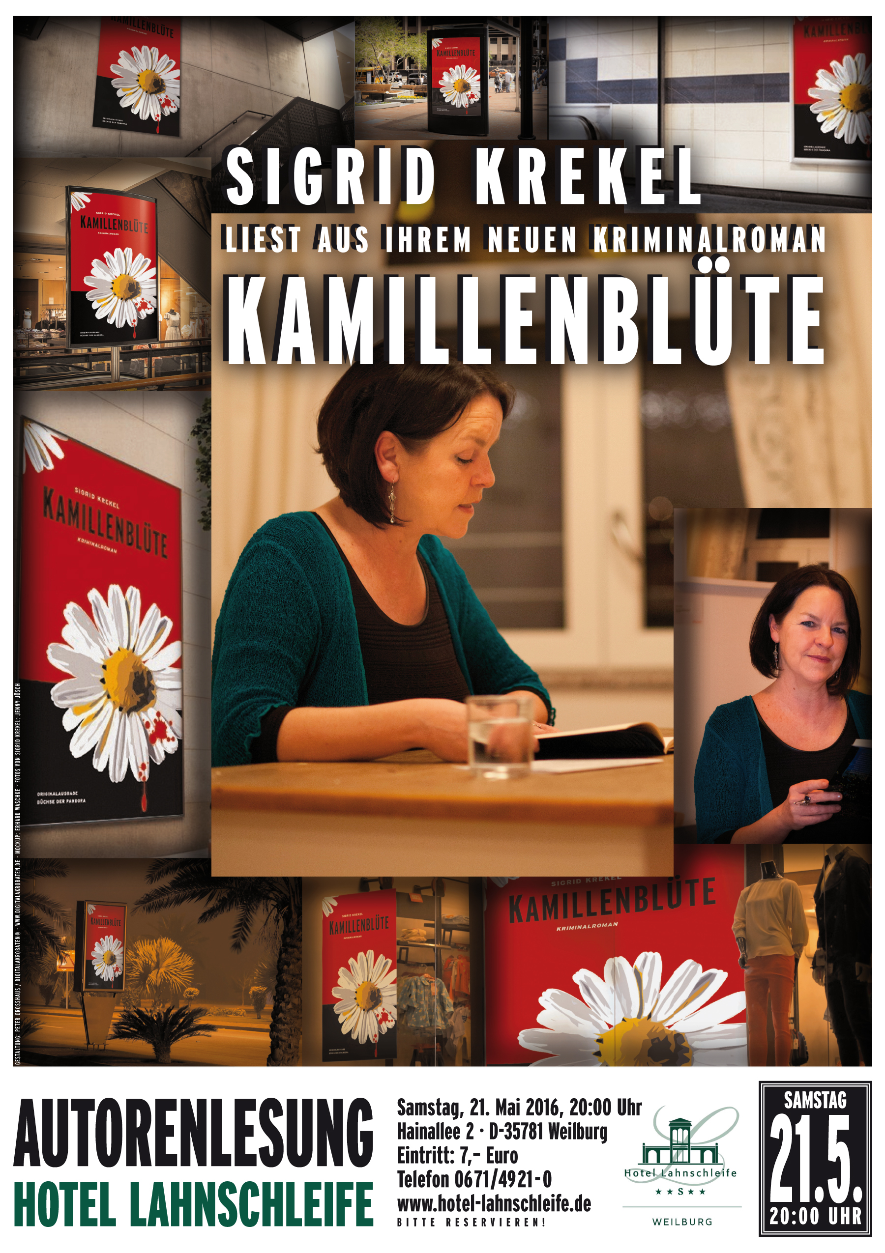 Am kommenden Samstag, 21. Mai, 20:00 Uhr lese ich aus meinem Krimi Kamillenblüte im schönen Weilburg direkt am Fluss im Hotel Lahnschleife/Café Haintor. Die Lesung kann separat besucht oder mit einem feinen Abendessen verbunden werden. Für das „Eat & Listen Paket“ bitte unbedingt reservieren. Ich freu mich drauf.
